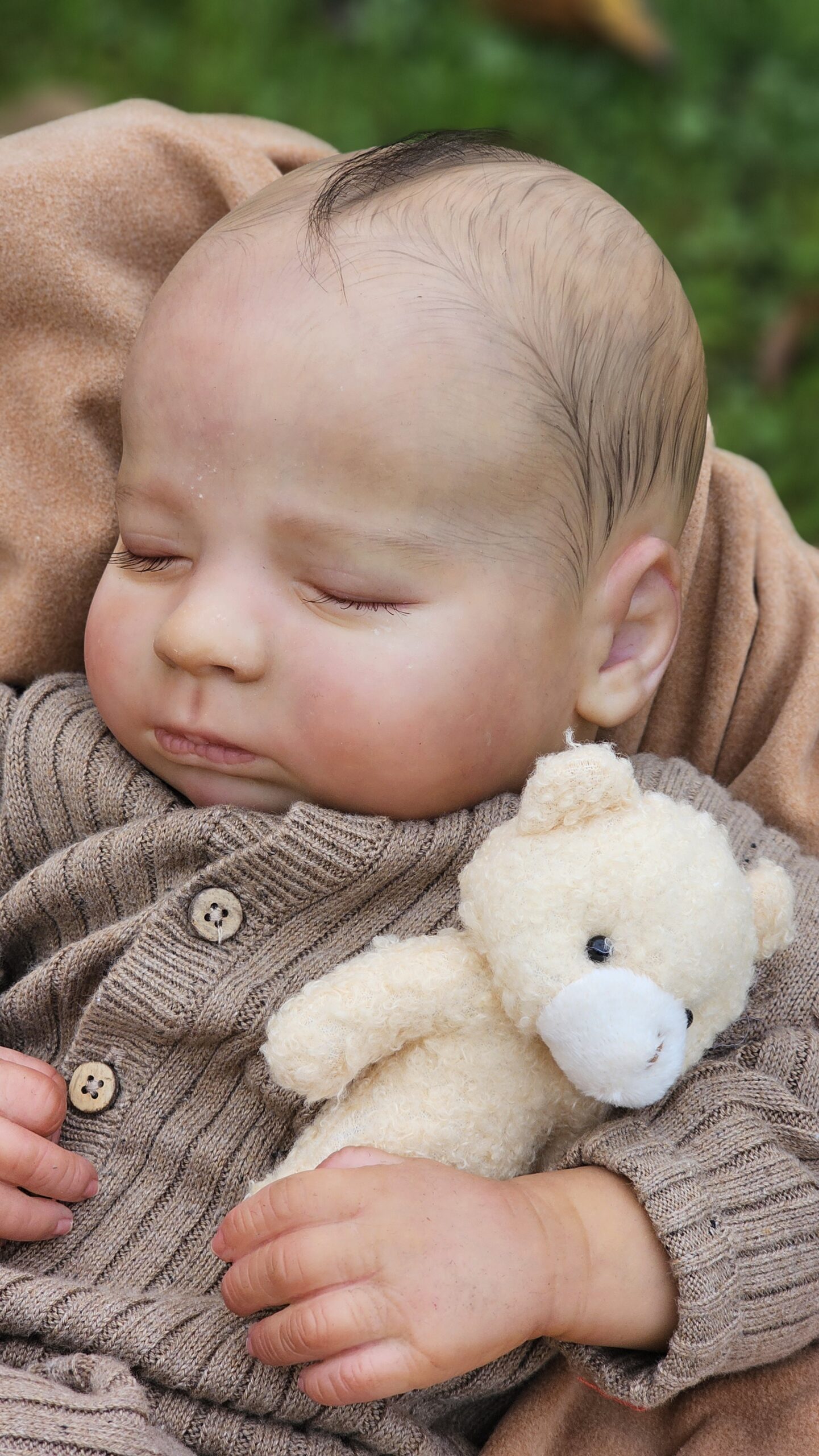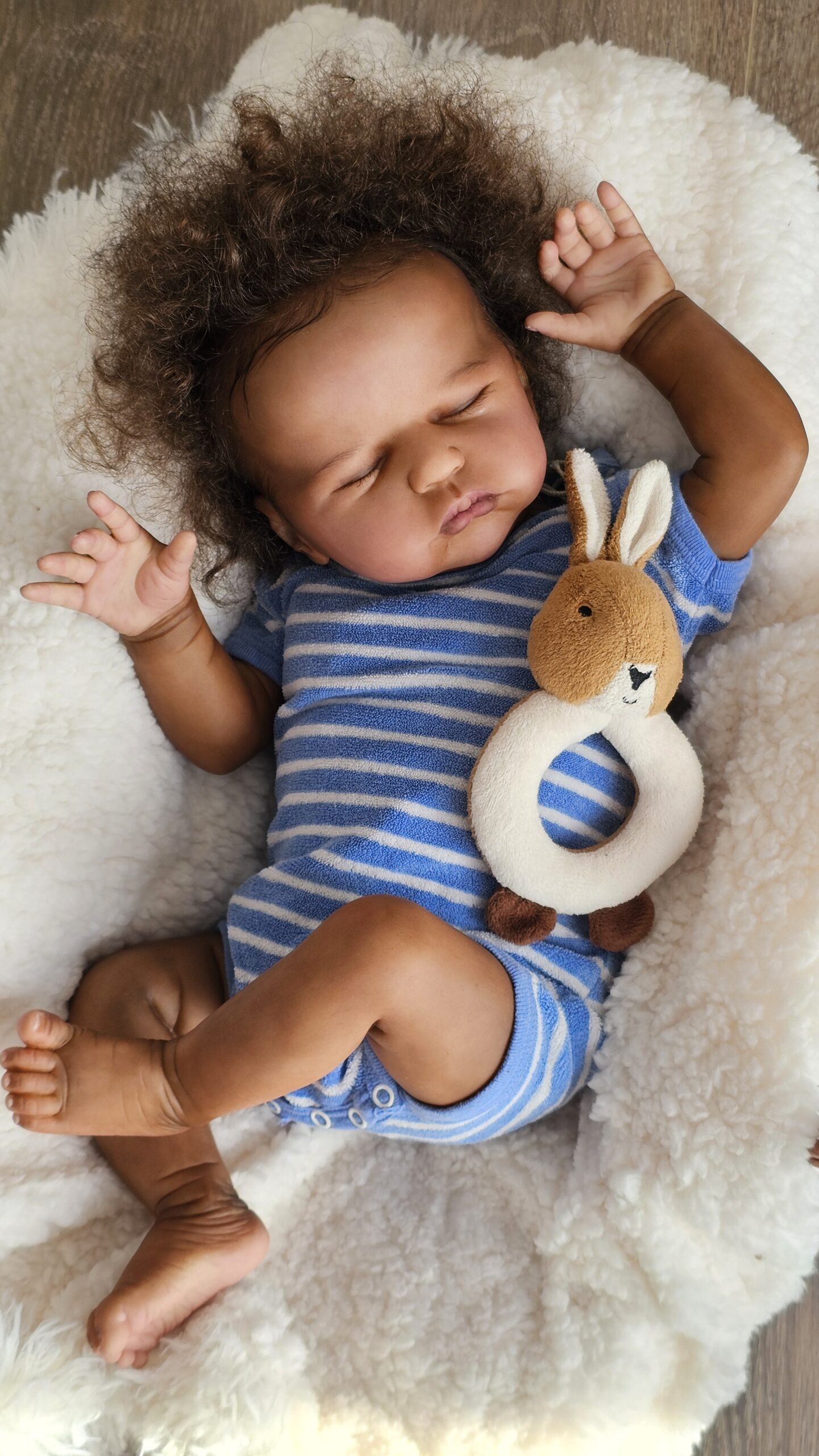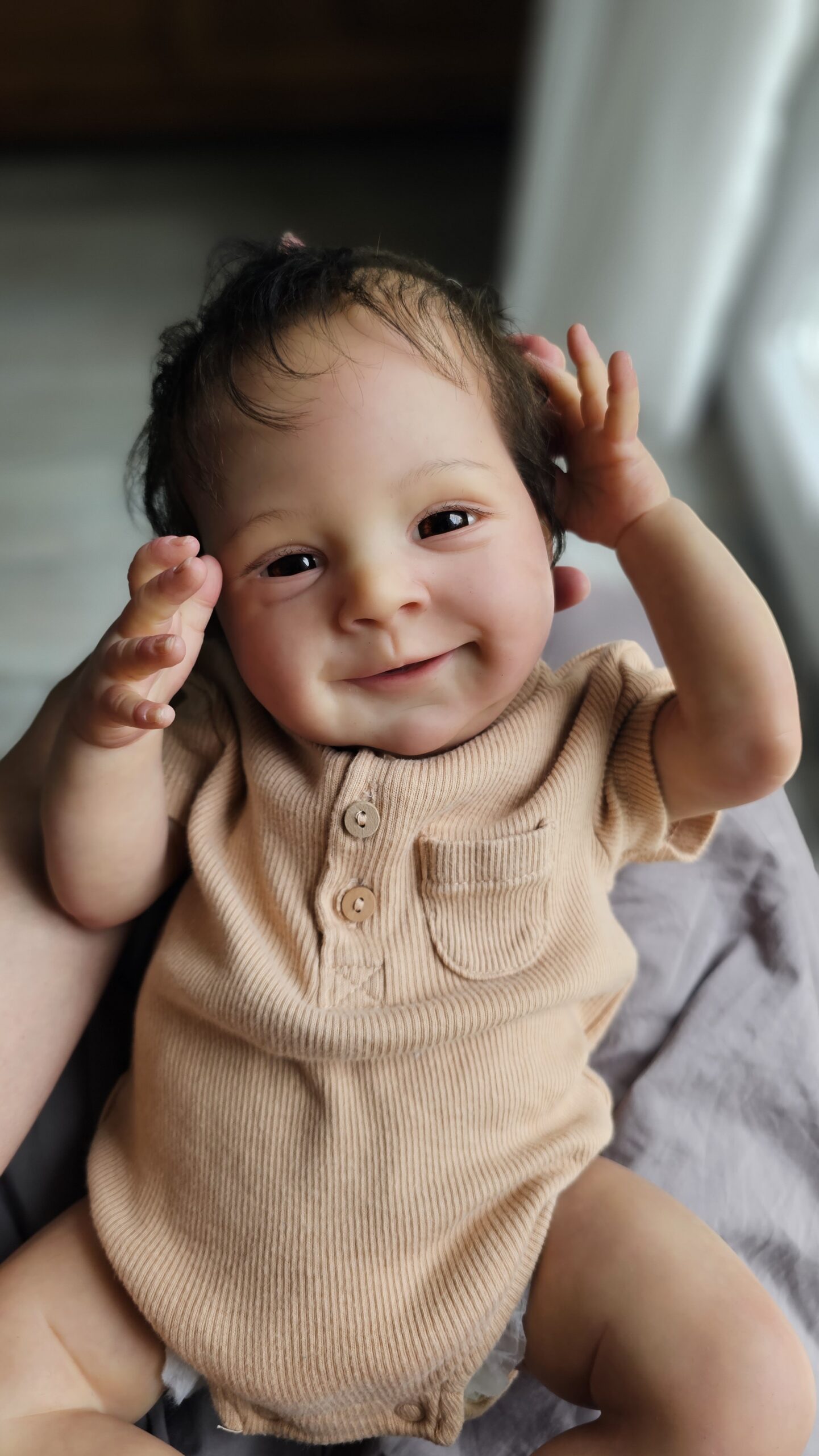 Ce grand bébé reborn garçon de taille 8 mois à été une grande réussite dont je suis très fière. J’ai eu beaucoup d’honneur et de joie à répondre à cette commande très spéciale. Possibilité de réaliser cette frimousse en version bébé reborn fille avec une couleur de cheveux au choix.