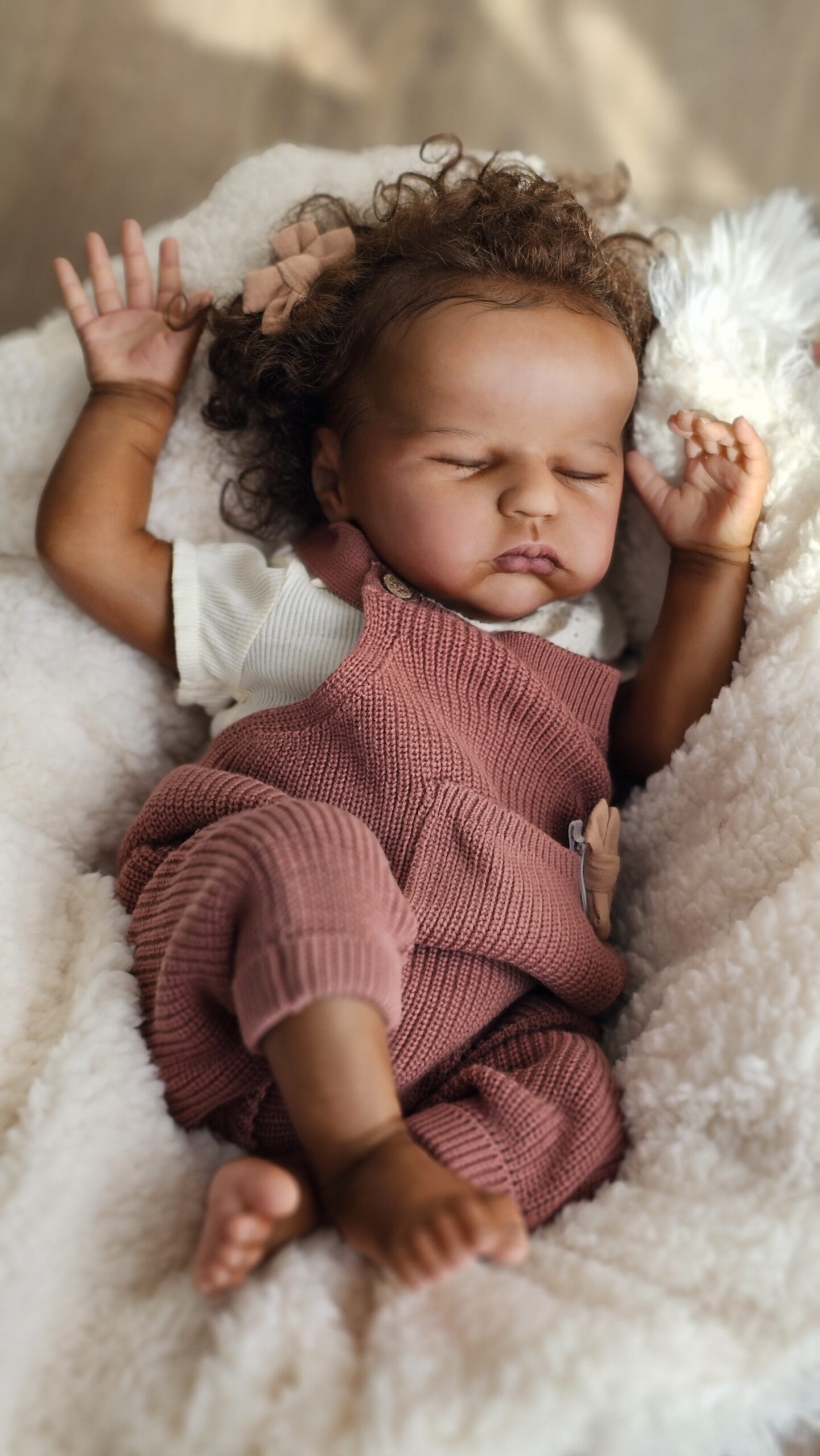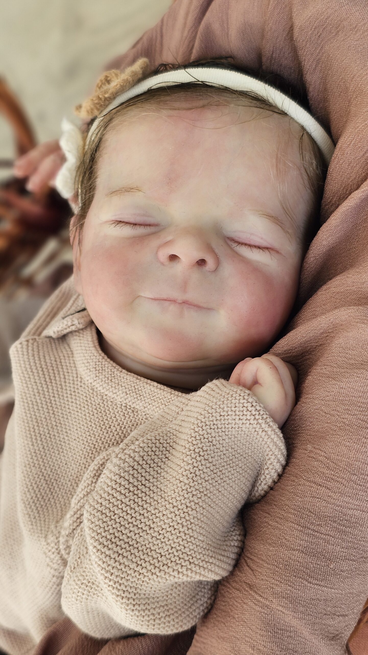 Découvrez ici un autre modèle de bébé reborn fille souriante. Cette création était une commande personnalisée à l’effigie d’une petite partie trop tôt dans les années 80. Un honneur pour moi de concevoir des bébés reborn pour permettre d’aider des parents à marquer la touche finale de leur étape de deuil. Aucune photo transmise n’est divulguée.
